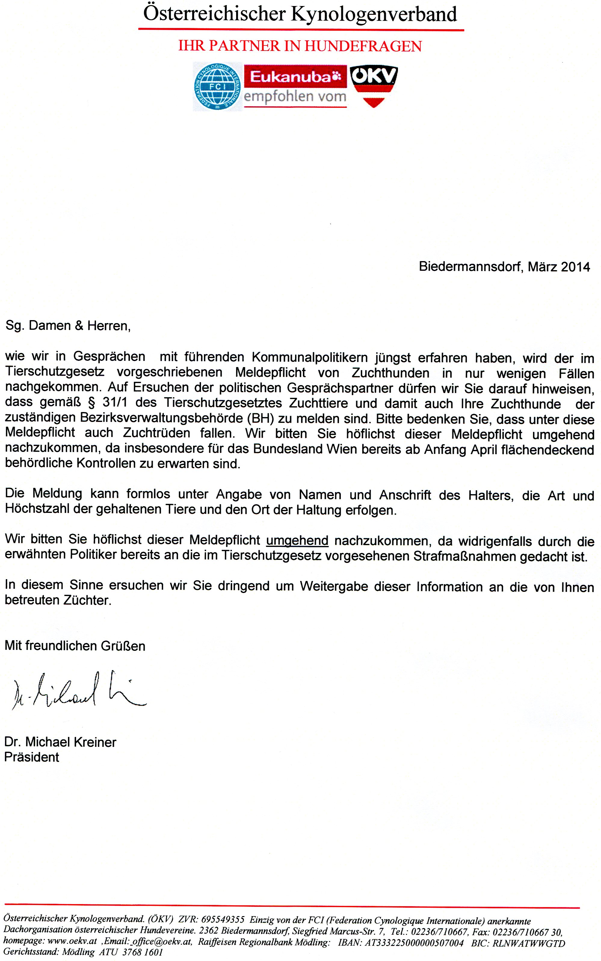 Schreiben vom ÖKV betreffend der Meldepflicht: